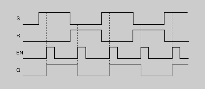 En la figura podem veure les formes d’ona de les entrades i la sortida d’un latch S-R amb habilitació. Se suposa que Q es troba inicialment a nivell baix.