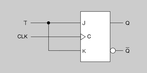 El flip-flop T està construït a partir d’un flip-flop J-K al qual s’han unit les seves entrades J i K directament, tal com es mostra en la figura. La taula de veritat d’aquest flip-flop T és molt senzilla (taula).