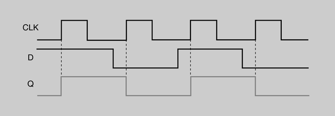 Com veiem en la taula, la sortida Q conserva el valor que té l’entrada D just en l’instant en el qual es produeix la transició positiva del rellotge. Aquesta propietat fa que el flip-flop D s’utilitzi molt com a element de memòria.