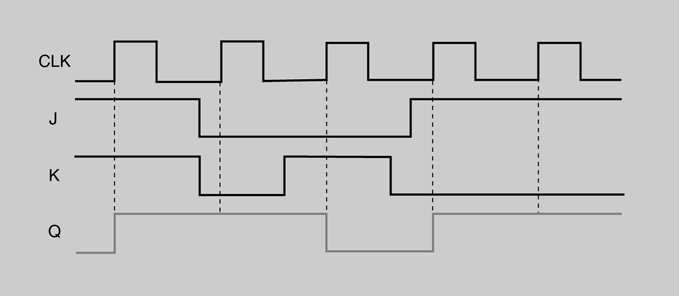 En la figura podem veure les formes d’ona de les entrades i la sortida d’un flip-flop J-K disparat per flanc positiu. Se suposa que Q es troba inicialment a nivell baix.