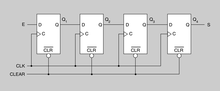 En la figura es mostra l’estructura d’un registre de desplaçament entrada sèrie/sortida sèrie de quatre bits, format per quatre flip-flops D amb senyal d’esborrat (CLR).
