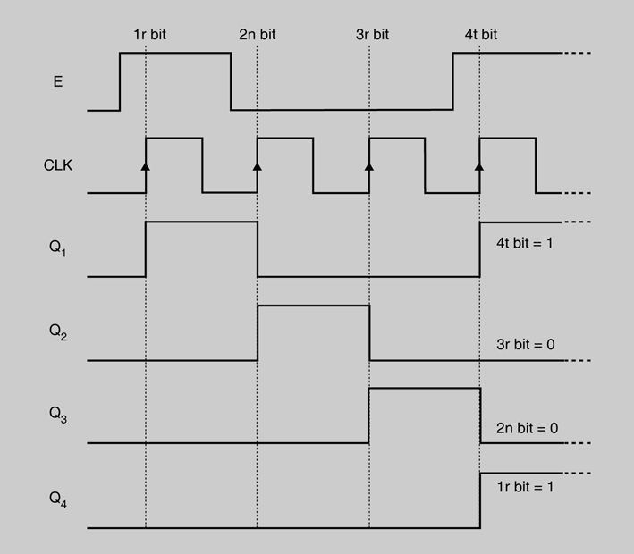 - Quan es produeix un flanc ascendent de CLK entra un bit per la línia E i es queda a Q1. En el mateix instant, el bit que era al punt Q1 passa a Q2, el que era a Q2 passa a Q3 i el que era a Q3 passa a Q4.