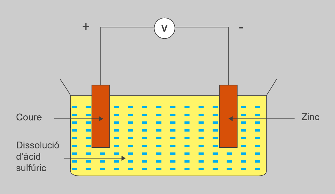 L’àcid sulfúric dissol les barres de coure i de zenc tot fent passar els seus àtoms a la dissolució. La barra de zenc cedeix àtoms a la dissolució i deixa una gran quantitat dels electrons a la mateixa barra. A la barra de coure passa una cosa similar, tot i que en aquesta barra s’acumulen molts menys electrons. El resultat és que la barra de zenc és molt menys negativa que la barra de coure, fet que fa aparèixer una diferència de càrregues o tensió elèctrica entre totes dues barres.