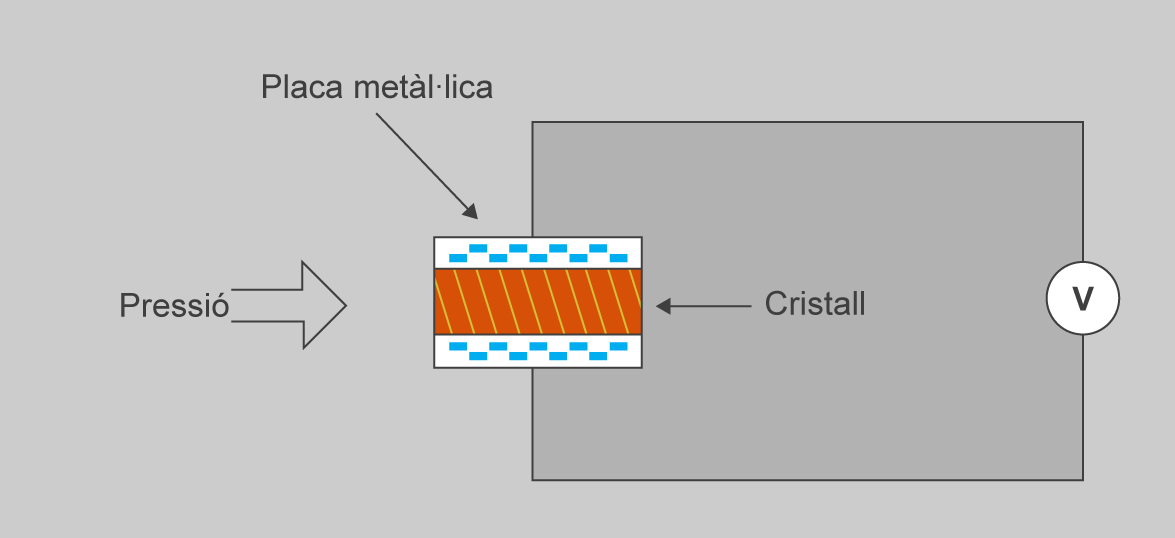 Hi ha certs materials, com els cristalls de quars, que en ser sotmesos a pressió entre les seves cares produeixen electricitat (vegeu la figura). D’això se’n diu efecte piezoelèctric.