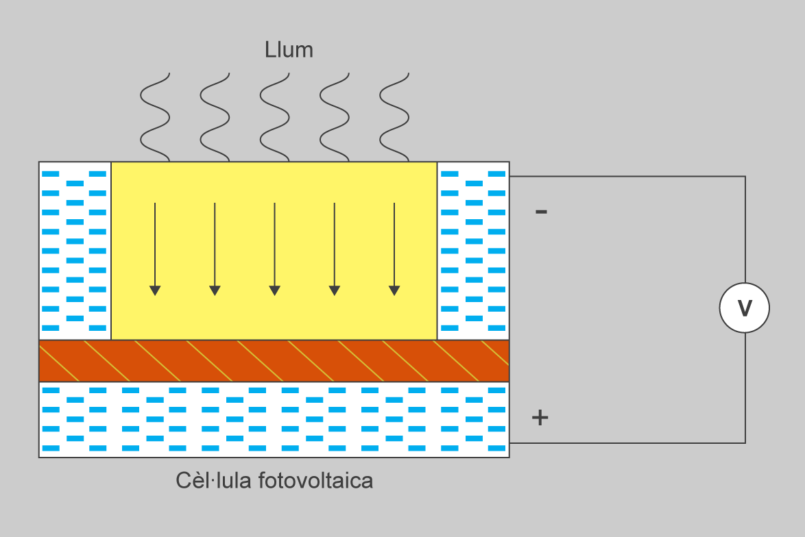 Alguns materials tenen la propietat de generar una diferència de potencial quan hi incideix la llum (vegeu la figura). L’energia que es genera d’aquesta manera rep el nom d’energia fotovoltaica.