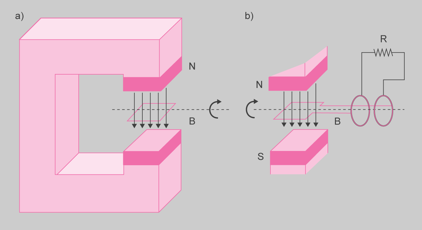 La generació d’electricitat per acció magnètica és la més usual a gran escala. Només cal pensar que totes les centrals elèctriques funcionen amb aquest sistema (vegeu la figura): un bobinatge conductor gira immers a l’interior d’un camp magnètic uniforme. En funció de la velocitat de gir del bobinatge, s’indueix un corrent variable.