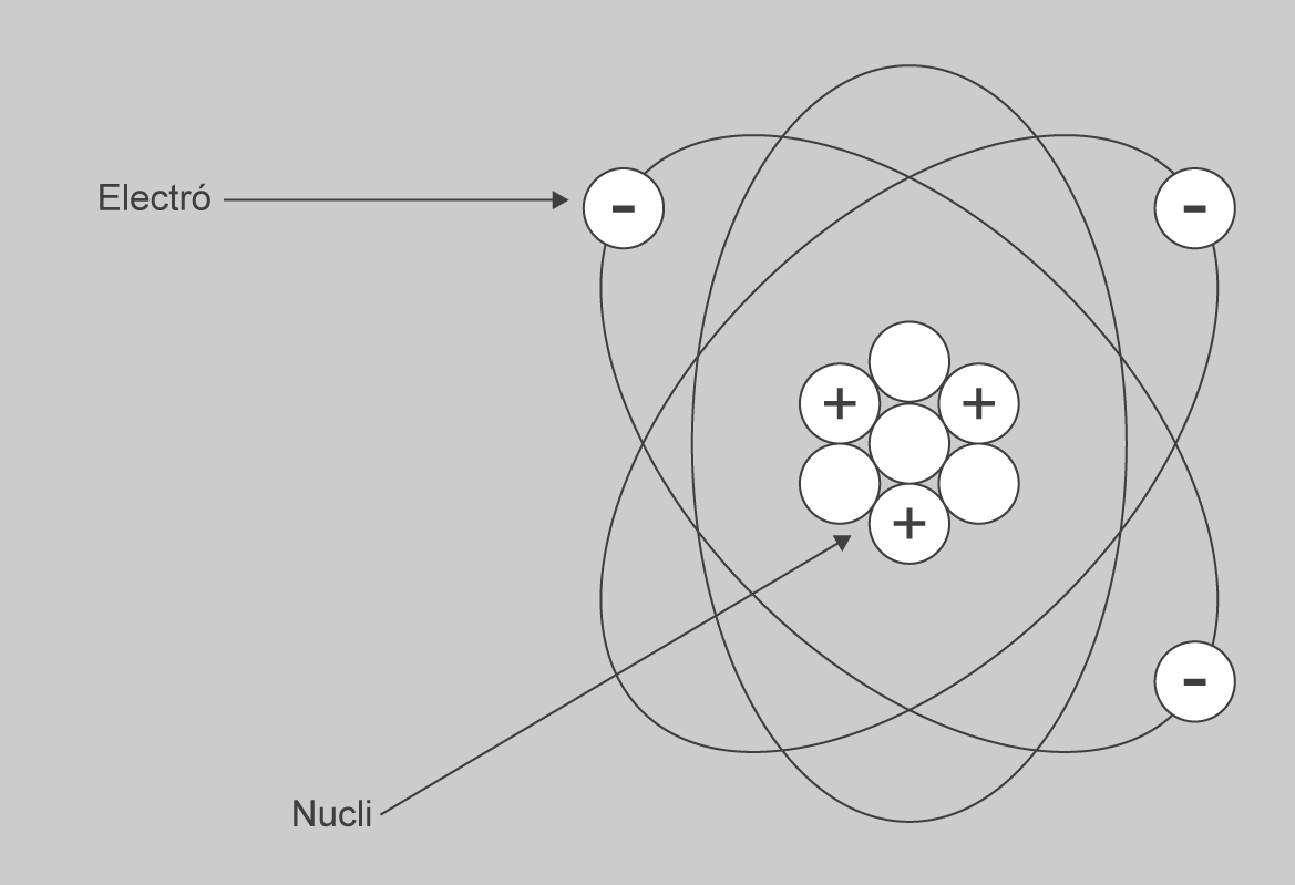 Les molècules estan formades per àtoms. Els àtoms estan formats pel nucli i l’escorça. En el nucli, juntament amb els neutrons, que no aporten càrrega elèctrica, hi ha les partícules de càrrega positiva, els protons. En l’escorça, en el que s’anomenen òrbites electròniques giren a gran velocitat unes partícules de càrrega negativa, denominades electrons. Com que les càrregues elèctriques de signe contrari s’atreuen, els electrons suren a curta distància, sense escapar, del nucli (figura). Quan un àtom té tants protons en el seu nucli com electrons en la la seva escorça, es considera que és elèctricament neutre.