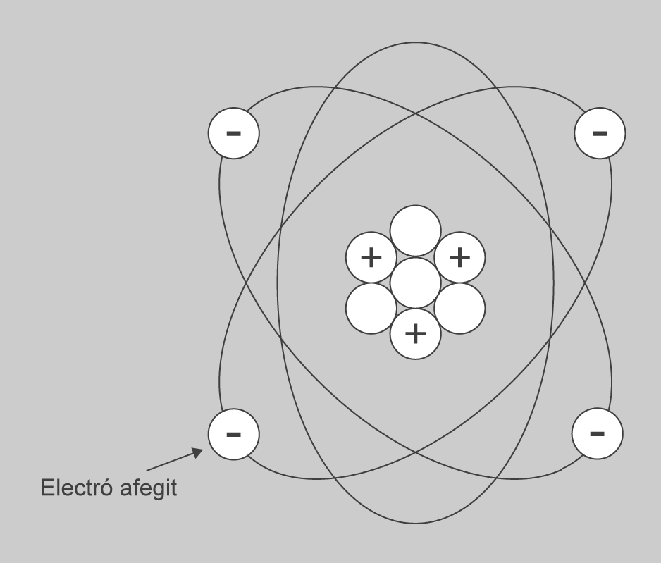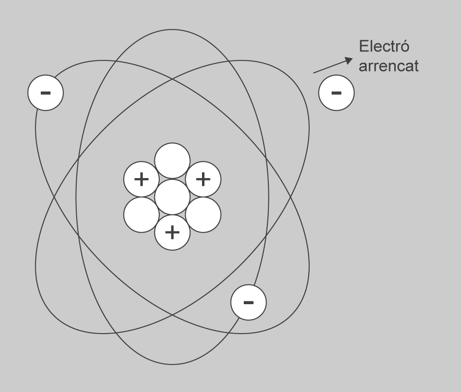 Els electrons giren a gran velocitat a l’entorn del nucli i la força d’atracció fa que no se’n separin. A vegades, però, aquesta unió es pot trencar i, conseqüentment, l’electró s’escapa de l’àtom al qual pertany. Aleshores l’àtom passa a tenir càrrega positiva, ja que té un protó de més (vegeu la figura).