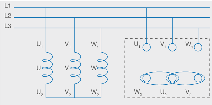 Els motors d’inducció de gàbia d’esquirol tenen tres bobinats a l’estator que són els que tenen connexió elèctrica a l’exterior. Aquests bobinats s’identifiquen amb les lletres U, V i W, i els seus extrems amb els números 1 i 2. D’aquesta manera, que és un estàndard, es facilita molt la seva connexió.