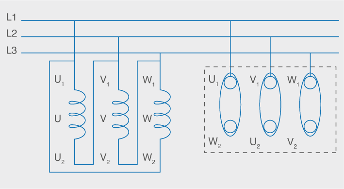 Per tal d’evitar els corrents elevats a l’arrencada, una estratègia molt comú és l’arrencada estrella-triangle. Amb aquesta configuració, les bobines del motor es connecten inicialment en estrella, de manera que les tensions als bobinats de l’inductor són les tensions de fase. Un cop ha arrencat, commutem les bobines a triangle, de manera que queden connectades a les tensions de línia, perquè el motor quedi funcionant als seus valors nominals. Vegeu l’esquema de connexió a la figura.