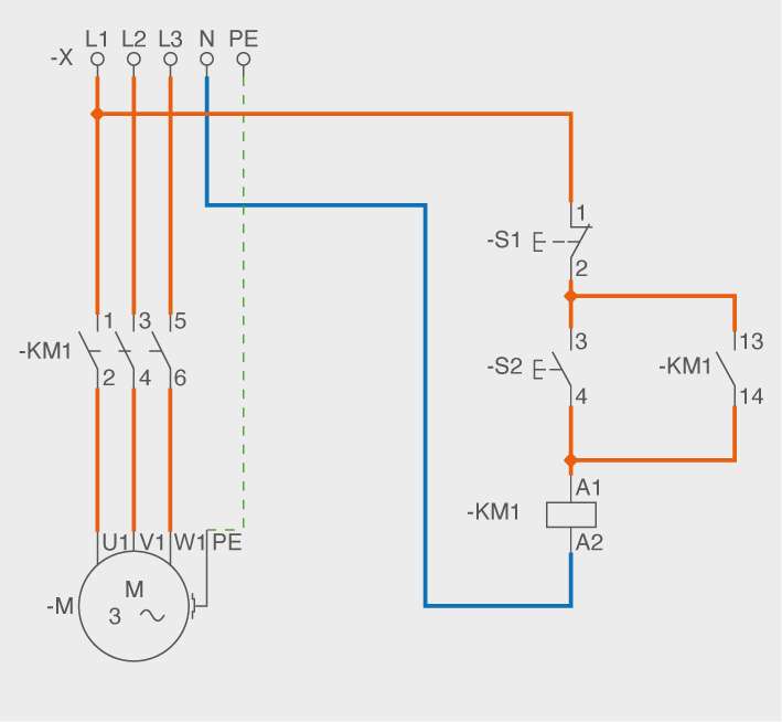 En aquest circuit, quan S2 es tanca alimenta l’electroimant de KM1, que fa commutar tots els seus contactes. L’electroimant resta activat per la realimentació realitzada pels seus contactes auxiliars 13-14, mentre que el motor arrenca ja que s’ha connectat a través dels contactes principals de KM1, que són 1-2, 3-4, i 5-6.