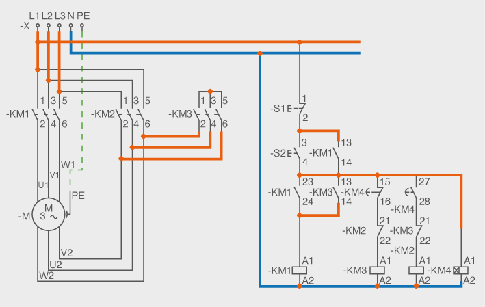 En prémer S2, s’inicia la seqüència d’arrencada. La bobina principal de KM1 s’alimenta i resta en aquest estat a través dels contactes 13-14 i 23-24 de KM1. A més, la bobina principal de KM3 també està alimentada a través dels contactes 15-16 de KM4 i 21-22 de KM2, amb la qual cosa el motor està connectat en estrella.