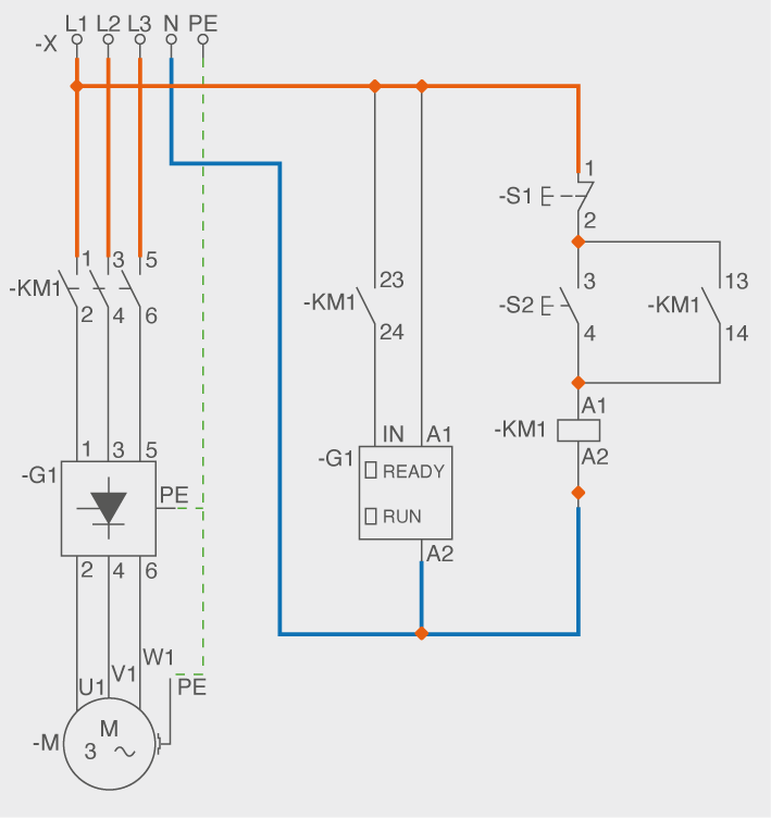 Per fer l’arrencada amb aquest sistema, premem S2, de manera que la bobina de KM1 resta alimentada. Els contactes principals commuten, de manera que queda connectada l’etapa de potència de G1, i els contactes 23-24 de KM1 també es tanquen, de manera que li diem a l’arrencador que iniciï la seqüència. A partir d’aquest moment, el G1 anirà augmentant la tensió que proporciona al motor en el temps prèviament establert.