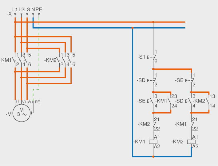 Per controlar aquest circuit necessitem un parell de polsadors que disposin de contactes NO i NT, com són SD i SE. Així, per arrencar el motor, podem prémer SD, de manera que KM2 quedarà alimentat. Si volem invertir el sentit de gir, haurem de prémer SE, amb la qual cosa KM2 es desconnectarà i quedarà alimentada la bobina de KM1.