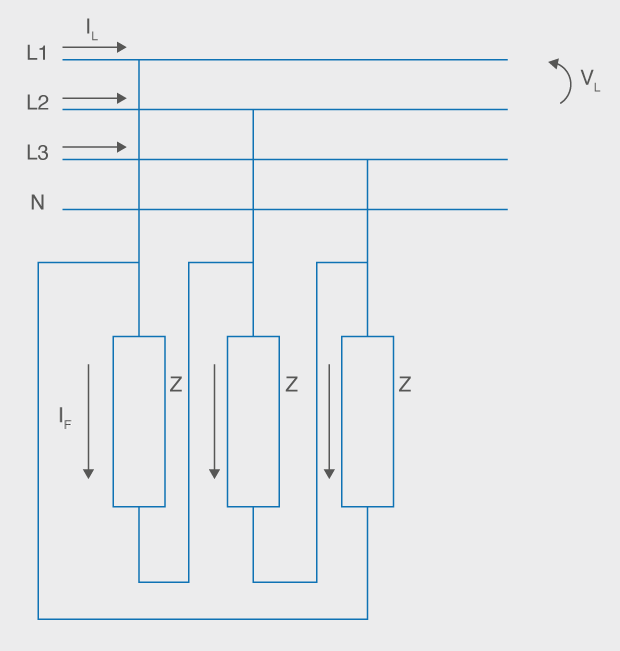 En el cas de la connexió en triangle, les càrregues es connecten entre dues línies, com es veu a la figura.