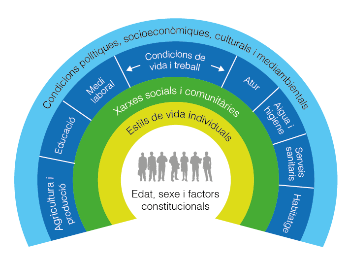 D’acord amb el que es pot observar en la figura, cal, doncs, comprendre la salut com un estat de benestar a diversos nivells. El nivell de salut física, el mental i el social. Són tan importants aspectes de tipus genètic o constitucional com el fet de mantenir determinats estils de vida. Igualment, observem que l’edat o el gènere són, al seu torn, condicionants fonamentals, com també ho són disposar de xarxes i espais sociocomunitaris d’afiliació i suport, les condicions de treball, l’entorn mediambiental i la seguretat alimentària, disposar o no d’un sistema de salut avançat, poder accedir als seus serveis, el nivell d’instrucció o altres condicionants socials i polítics.