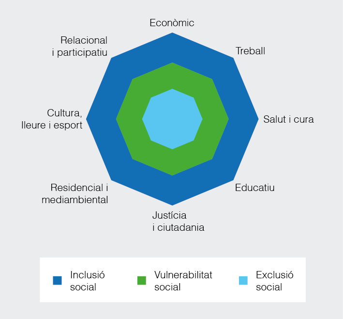 Els vuit àmbits d’inclusió/exclusió que tot seguit es passa a descriure són una adaptació dels àmbits d’exclusió social descrits per molts autors i utilitzats com a elements d’anàlisi en molts estudis especialitzats de referència (Foessa, IGOP, Comissió Europea…). Es presentaran oferint també algunes claus per a entendre les possibles situacions o factors d’exclusió social que a cadascuns d’ells es poden produir. Es citaran també algunes de les accions que des de l’àmbit de la intervenció social es poden realitzar i alguns plantejaments i iniciatives socials actuals que són interessants per reflexionar sobre el paper que pot tenir la societat civil organitzada en la generació d’entorns socials o econòmics més inclusius o en la facilitació de processos d’inclusió.