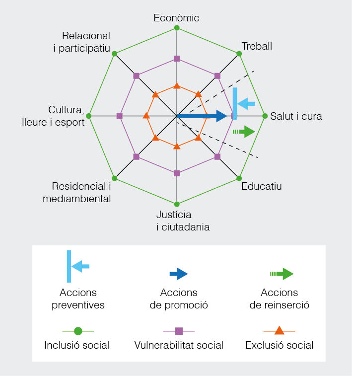 L’àmbit de la salut i de la cura és un altre dels àmbits d’inclusió fonamentals. Gaudir d’un bon estat de salut no és només clau en si mateix per al benestar de les persones i la seva inclusió social. Com ja s’ha assenyalat, els processos d’exclusió social presenten una dimensió subjectiva que afecta les persones que els pateixen. Experimentar situacions de vulnerabilitat en qualsevol àmbit pot conduir-les a situacions que comprometin també el seu capital de salut. L’exclusió social té caràcter acumulatiu, i la presència d’una situació d’exclusió en qualsevol àmbit pot desencadenar l’acumulació d’altres factors en àmbits diversos. La salut és potser l’àmbit que presenta el caràcter acumulatiu més acusat dels descrits.
