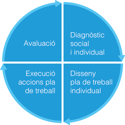 Aquesta lògica d’anàlisi i atenció als contextos socials particulars en els quals es vol treballar funciona també a nivell del treball individual de casos. Efectivament, en el treball social acostuma a fer-se el que es coneix com diagnòstic social. Aquesta és una eina fonamental que permet analitzar el detall de condicionants socials que presenten les persones en diversos àmbits. A partir d’aquest diagnòstic s’elaboren el Plans educatius individuals (PEI) o els Plans de treball individual (PTI), definint el conjunt d’objectius que es marquen per afavorir la inclusió social de la persona, les activitats i els terminis per assolir-los i els recursos que s’han de mobilitzar. Com es pot observar en la figura, la lògica a nivell de treball individual és idèntica.