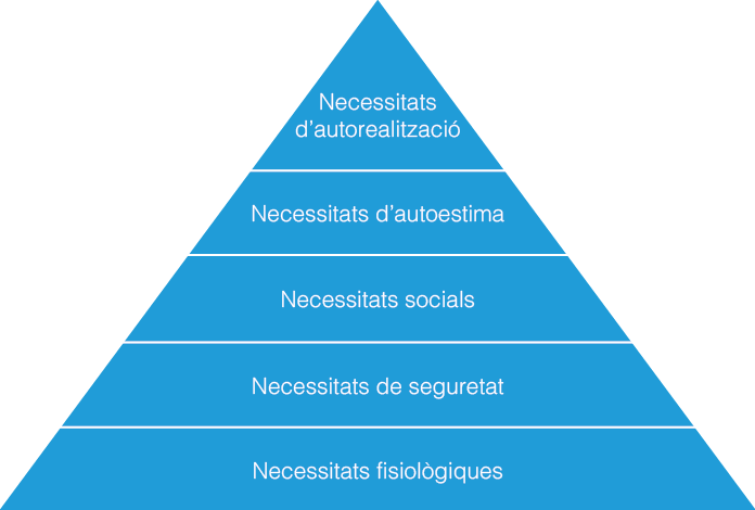 A. Maslow (1998), amb la seva piràmide de necessitats, és un dels autors clàssics a considerar quan es parla de caracteritzacions de les necessitats humanes. Planteja un seguit de necessitats jerarquitzades en cinc nivells. De les més bàsiques i fisiològiques, que fan referència al manteniment de la vida, a les més lligades a la satisfacció i realització personal. Planteja que la jerarquia de necessitats implica que les persones es preocupin per la seva satisfacció d’una forma gradual. Només quan les necessitats més bàsiques són cobertes es pot pensar a satisfer les necessitats d’ordre superior En la figura es pot observar aquesta jerarquització.