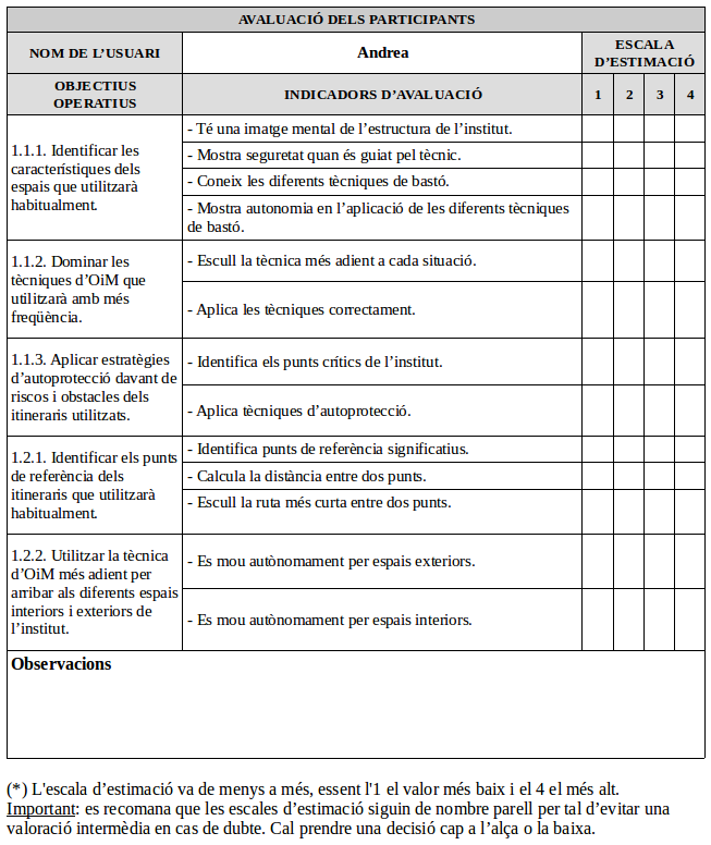 - Un desenvolupament que inclourà els objectius que volíem aconseguir, les activitats que havíem planificat i les que hem fet, així com les orientacions que recomanem per afavorir l’autonomia d’orientació i mobilitat de l’Andrea.