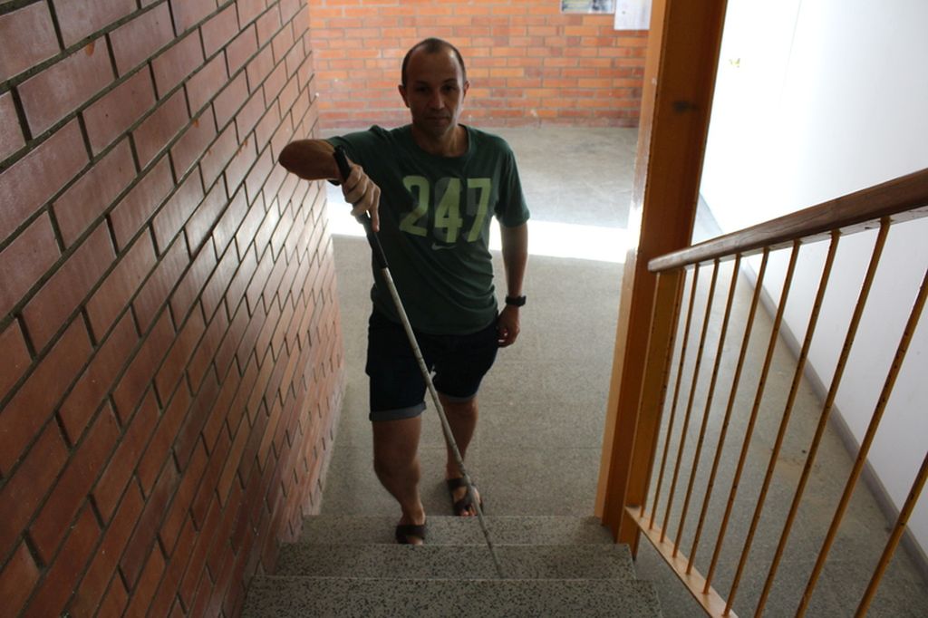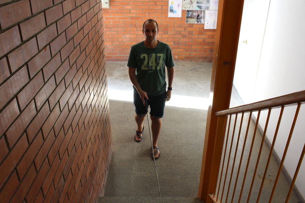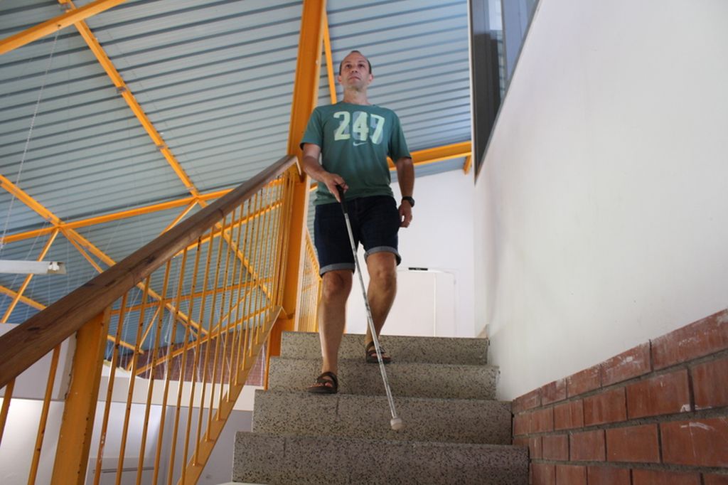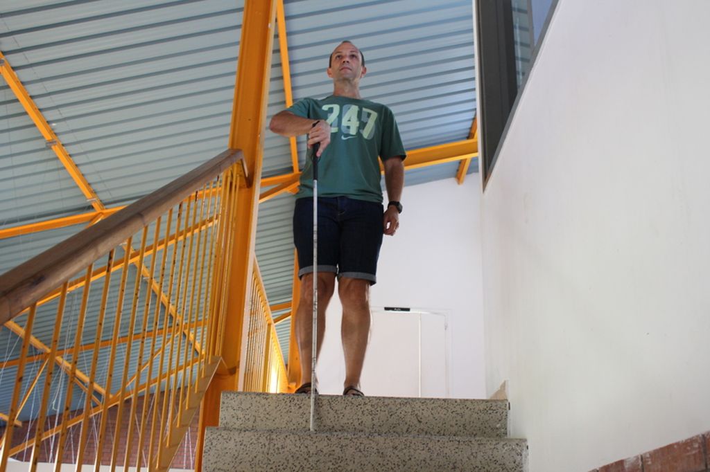- Tècnica per pujar i baixar escales: l’Andrea es col·locarà a la dreta de l’escala i agafarà el bastó en forma de pinça, de manera que la virolla del bastó haurà de servir per mesurar l’alçària i l’amplada del graó. Amb aquesta informació podrà superar els graons, amb el bastó sempre un graó per davant, tocant-ne la vora. Quan el bastó no percep més graons, significa que s’ha arribat a un replà de l’escala o que ja no hi ha més graons.