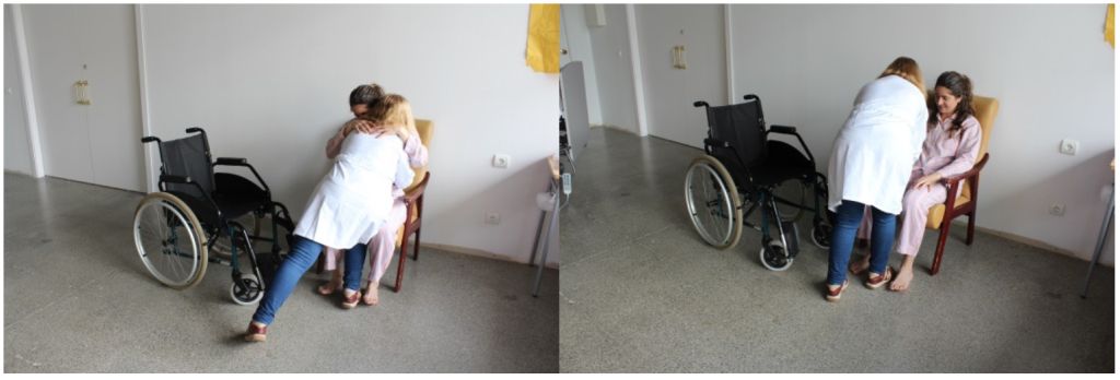 - Elevem i desplacem el tronc de l’usuari cap a ell mateix i al mateix temps fem un balanceig de davant cap enrere.
