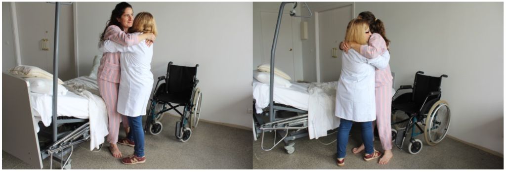 - Fem un senyal, l’aixequem cap a amunt i el conduïm amb la seva ajuda fins a l’extrem del llit.