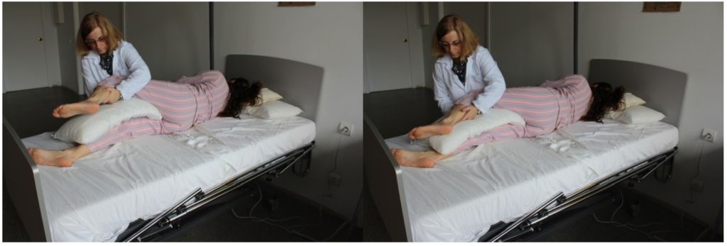 - Se li demana que s’agafi al capçal del llit i que flexioni els genolls tot recolzant els peus sobre el matalàs.