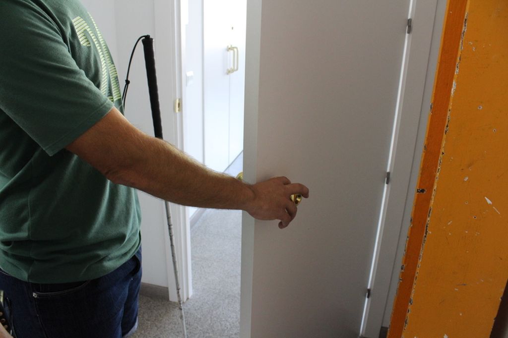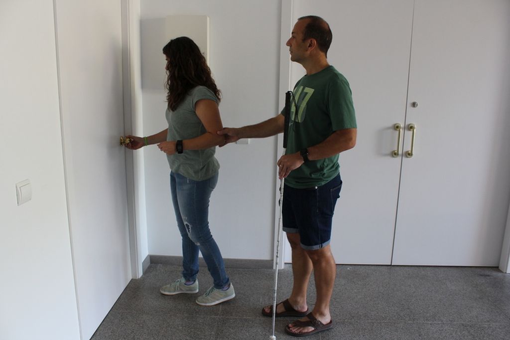 - Seguidament agafarà la mà de l’Andrea i la col·locarà sobre el pom, d’aquesta manera l’Andrea pot intuir cap a quin costat s’obre la porta.