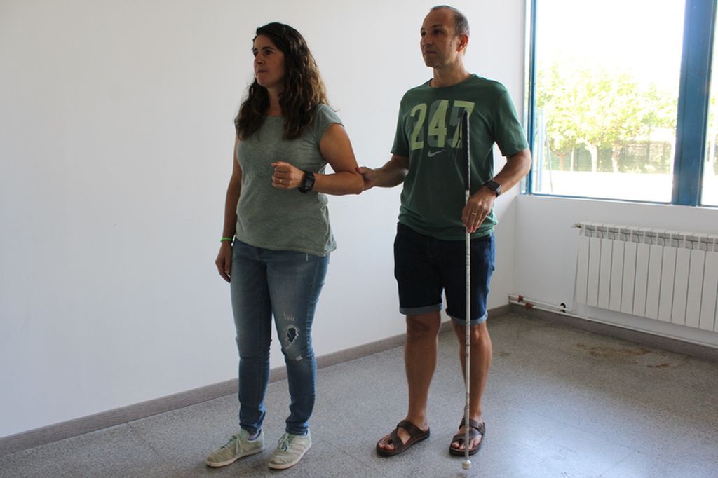 El tècnic o el cuidador s’ha de posar al costat de la persona que pretén guiar, una miqueta més avançat, però mai massa allunyat de l’usuari perquè no perdi el seu camp de visió. Seguidament ajudarà l’usuari perquè s’agafi de l’avantbraç del tècnic per tal de mantenir l’estabilitat de la marxa. Tot seguit, s’inicia la marxa, i el tècnic ha d’indicar en tot moment amb quina cama comencen a caminar i s’ha d’adaptar sempre al ritme de l’usuari (vegeu la figura).
