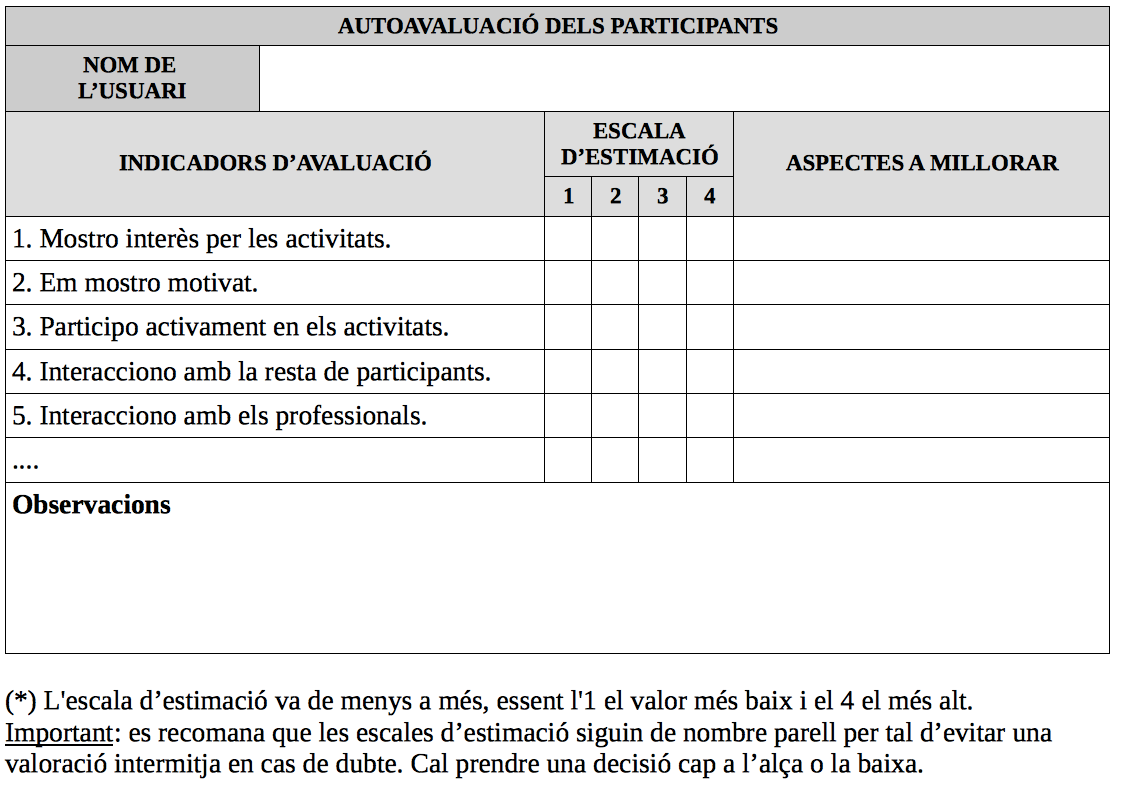A banda de l’avaluació que puguem fer nosaltres de cadascun dels participants, és recomanable donar l’oportunitat als participants per mostrar la seva opinió sobre el seu procés d’aprenentatge; és el que s’anomena autoavaluació dels participants.