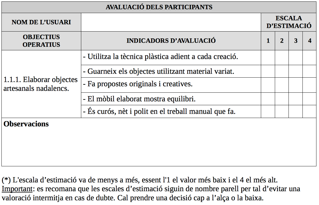 Prenent com a referència el taller de manualitats nadalenques, l’avaluació dels participants la concretaríem en els següents indicadors d’avaluació: