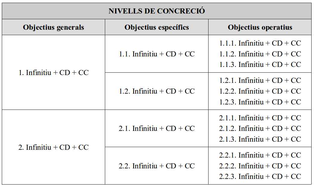 En definitiva, els nivells de concreció han de ser coherents entre si, i cada objectiu d’un nivell ha de ser concretat, com a mínim, en un objectiu del següent nivell. A l’hora de redactar-los s’ha de seguir un ordre i repetir la mateixa estructura: verb en infinitiu, complement directe i complement circumstancial (vegeu la taula).