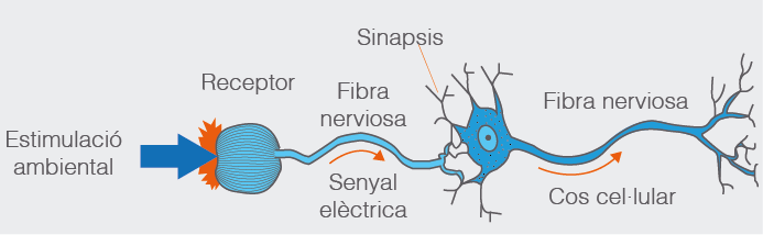 D’aquesta manera, abans de dotar de significació allò que percebem, necessitem captar la informació amb els nostres sentits transformant l’energia física (de l’ambient) en energia elèctrica, així el nostre sistema nerviós pot transferir la informació codificada al nostre cervell; és el que coneixem com a transducció. Una vegada al cervell, aquesta s’interpreta i s’elabora (vegeu la figura).