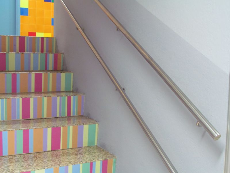 - Barreres arquitectòniques en l’edificació. L’entrada a l’edifici ha de ser accessible, i si hi ha desnivell ha de comptar amb una rampa i escala amb passamans (vegeu a la figura uns passamans, a l’escala, adaptats a l’altura de l’alumnat perquè estableixen dos nivells de suport). A la zona de patis, l’itinerari ha de garantir la lliure circulació per a persones amb mobilitat reduïda i el paviment ha de ser antilliscant. El vestíbul ha de permetre la mobilitat d’una persona amb cadira de rodes, en cap cas ha de tenir menys d’1,5 m de diàmetre. Els passadissos han de comptar amb passamans i les portes amb sistemes d’obertura fàcil, i ambdós han de tenir una amplada d’1,5 m per tal d’assegurar el pas de qualsevol producte de suport per a la mobilitat. Si l’edifici compta amb més d’una planta ha de tenir ascensor. Amb referència al mobiliari, aquest ha d’estar pensat per ser utilitzat per tothom. Les taules han de permetre l’aproximació frontal de persones amb qualsevol producte de suport necessari (ortesi o pròtesi). S’ha d’avaluar l’altura de les prestatgeries i les distàncies d’abast. A més, és important que a les aules hi hagi suficient espai per maniobrar. Els lavabos han d’estar adaptats i ser accessibles per a tot l’alumnat.