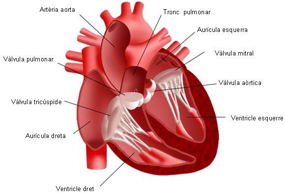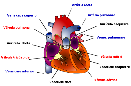 - El cor esquerre: l’aurícula esquerra rep sang oxigenada procedent dels pulmons. El ventricle esquerre envia la sang oxigenada per l’artèria aorta per distribuir-la per tot el cos. En el cor esquerre hi ha sang oxigenada.