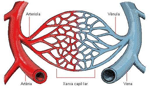 - Capil·lars: són els vasos sanguinis més petits. Els capil·lars constitueixen el punt d’unió entre els vasos arterials i els venosos. La funció dels capil·lars és fer possible l’ intercanvi metabòlic entre la sang i els teixits.
