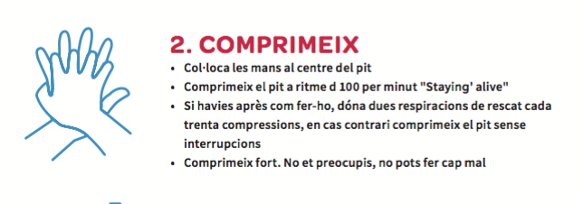 Recordeu que, per comprovar la respiració, cal sentir la respiració a l’orella, observar que el tòrax puja i notar l’aire a les galtes.