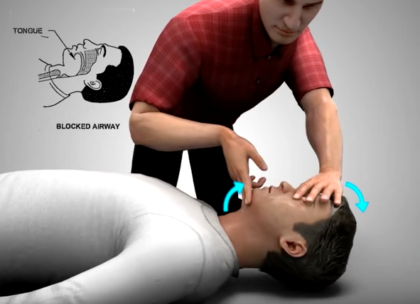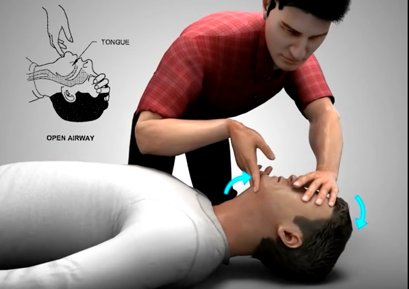 Quan la víctima està inconscient i en posició de decúbit supí / panxa enlaire, hi ha risc que la llengua es relaxi, caigui enrere i obstrueixi el pas de l’aire. Per això, el primer que s’ha de fer és afluixar-li la roba si dificulta la respiració i obrir la via aèria per permetre el pas d’aire als pulmons mitjançant la maniobra front-mentó, tret de si se sospita que hi pot haver una lesió cervical. En aquest cas s’ha de fer servir la maniobra d’elevació mandibular. Així s’aconseguirà una tracció de la llengua i s’alliberarà el pas de l’aire (vegeu la taula).