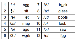 1. Now look at the IPA symbols of the following vowel sounds and pronounce the words in the chart: