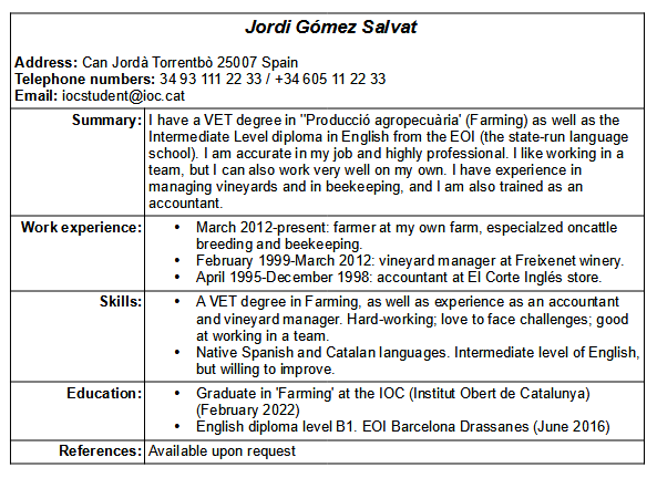 It might happen that one day you decide to look for a job in another country or to join an international NGO or any other type of organization. To do so, you will most probably need to send your curriculum vitae (or CV), which is usually accompanied of a cover letter explaining why you are applying and summarizing the contents of your CV. Therefore, in this section you will get some advice to write a good CV and cover letter in English.