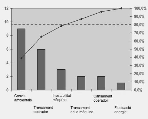 La utilització del diagrama d’Ishikawa es pot complementar amb l’ús del diagrama de Pareto, ja que aquest permet prioritzar les mesures d’acció rellevants en aquelles causes més problemàtiques. A la figura teniu un exemple d’un diagrama de Pareto sobre les causes que han produït accidents de treball.