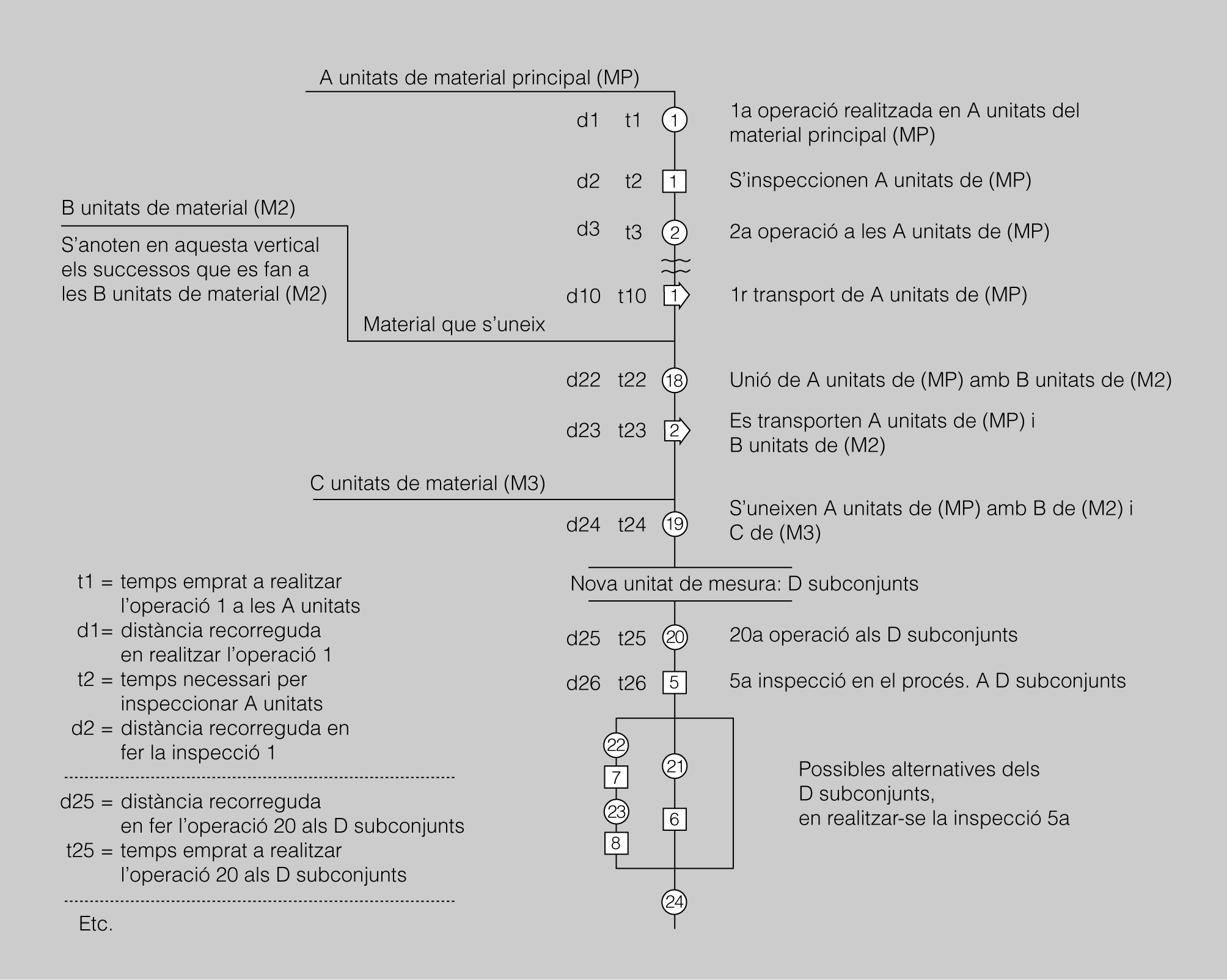 - El diagrama sinòptic de procés: cursograma que presenta una visió general de com se succeeixen les operacions principals. Solament utilitza dos símbols: operació i inspecció.