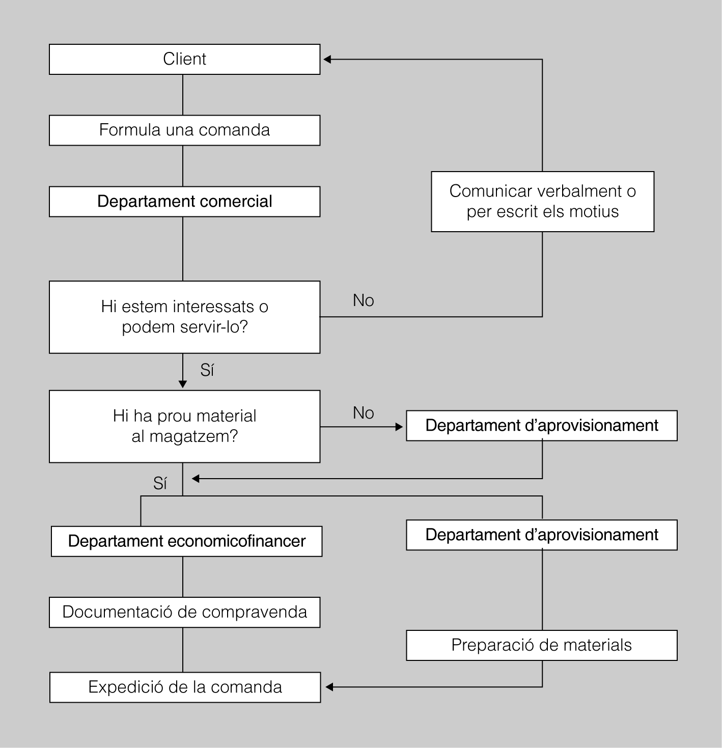 Cada operació només està indicada, i la seva descripció és la que consta en la seva columna. El pas d’una operació a altra s’indica mitjançant una línia contínua. Observeu aquestes indicacions en la figura. Es representa el procés de recepció d’una comanda i com es complimenta.