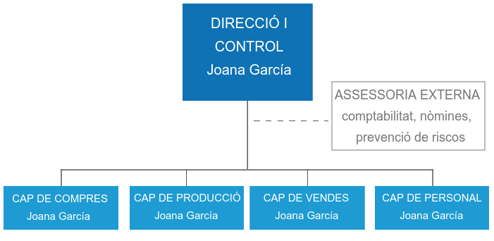 A la figura podeu veure l’organigrama genèric d’una empresa, amb una relació de possibles funcions i competències dins de cada grup de l’organització de l’empresa.
