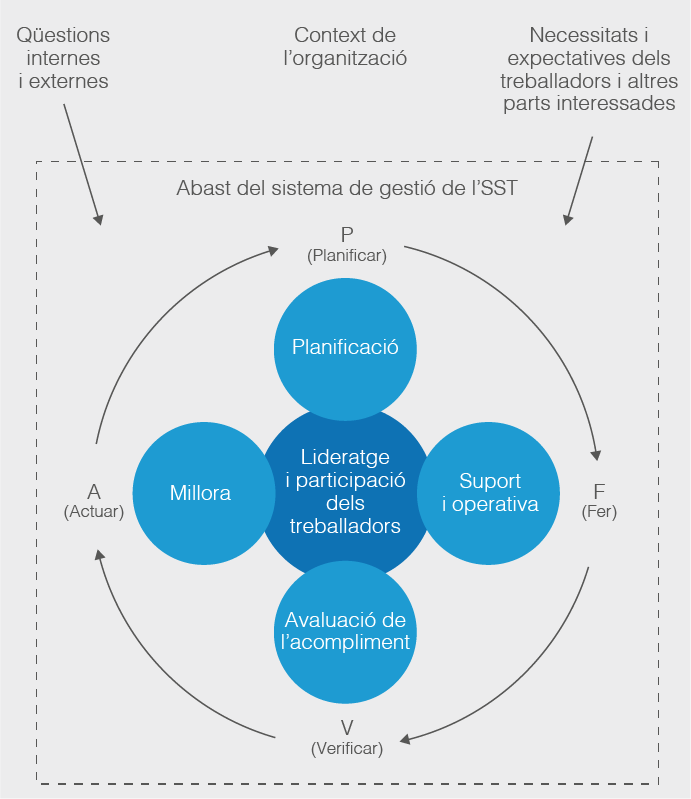 Aquest conjunt d’elements mútuament relacionats que actuen entre si s’anomena Sistema de Gestió de la Prevenció de Riscos Laborals (SGPRL, en endavant). Es tracta de la part del sistema general de gestió de l’organització que defineix la política de prevenció i que inclou l’estructura organitzativa, les responsabilitats, les pràctiques, els procediments, els processos i recursos per dur a terme aquesta política.
