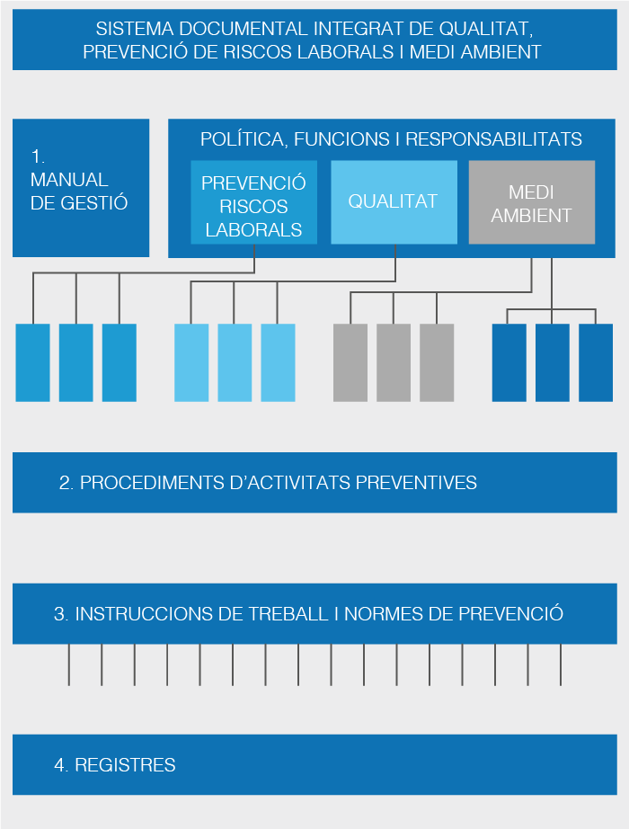 Un sistema documental unitari entre els sistemes de gestió de prevenció de riscos, qualitat i medi ambient hauria de definir fonamentalment els mecanismes per a la identificació de tots els documents, amb referència a la seva data d’actualització, les diferents vies per a l’elaboració de procediments, l’aprovació i control de distribució, arxius centralitzats i descentralitzats, revisió documental…