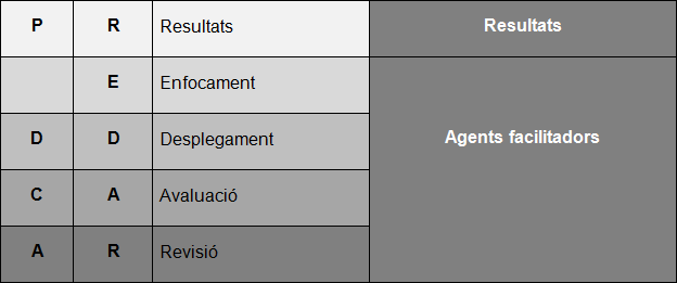 Per bé que en el model apareixen en primer lloc els criteris sobre els agents i després els criteris sobre els resultats, la base lògica del model és que les organitzacions se centrin primerament en quins resultats els agradaria obtenir i, en funció d’aquesta anàlisi, que treballin els criteris agents apropiats per millorar els resultats.