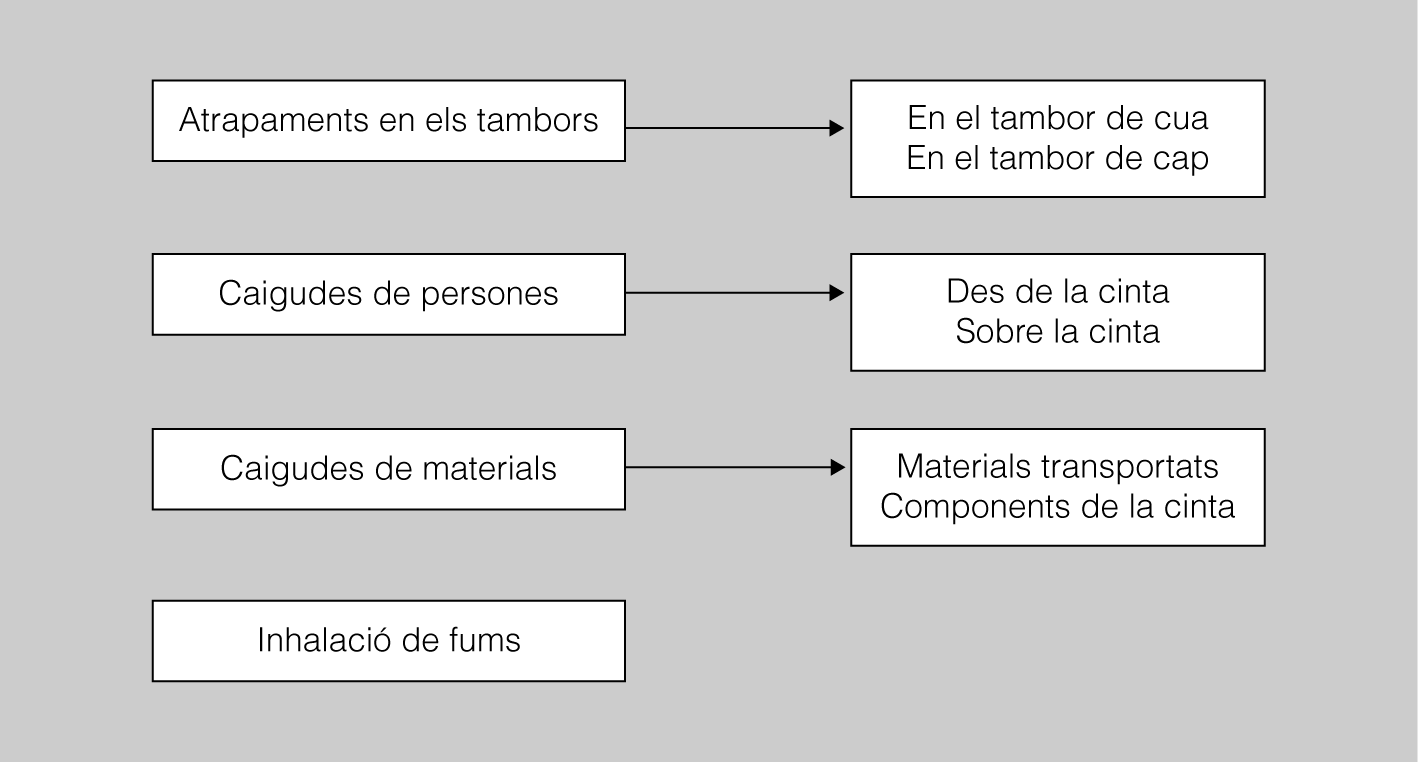 - Caigudes de persones a diferent nivell des de la mateixa plataforma per basculament del conjunt de l’equip per estar situat sobre una superfície inclinada, d’insuficient resistència, per falta d’estabilitzadors.